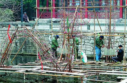 昨日,济南市趵突泉第30届迎春花灯会正在趵突泉公园内紧张筹备中。据了解,今年花灯会共有33组大型灯组参展。