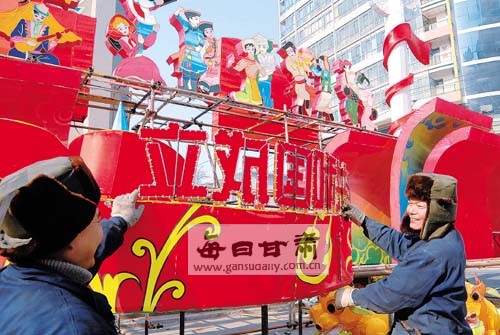 近日,来自四川自贡的工艺师傅们,正在兰州市西固春节灯展布展现场抓紧安装。灯展将展出各类彩灯120余组,设有中国航天、北京奥运、共和国长子等灯组。甘肃日报记者 张铁梁 摄