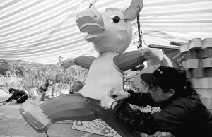 1月4日,在海口市万绿园,工人们正在制作牛生肖造型彩灯,以迎接第四届海口市万春会。