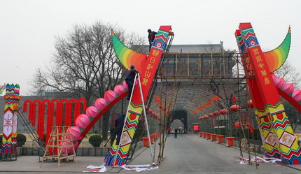 1月6日,工作人员正在西安南城墙上布置灯展。农历牛年即将来临,西安城墙新春灯会正在抓紧准备,今年城墙新春灯会将有玲珑牛、人文西安、迎春门、陕西民俗等30多组灯亮相。 (记者 袁景智摄)