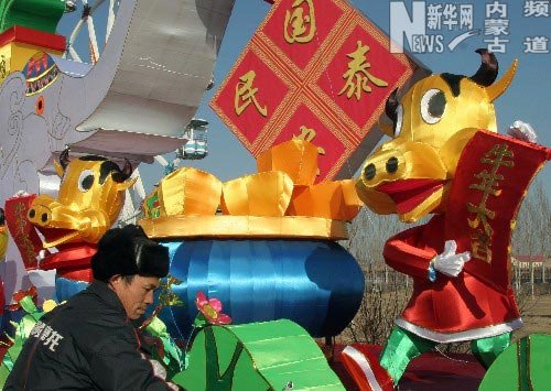1月9日,来自彩灯之乡四川自贡的艺人在内蒙古赤峰市海贝尔第五届迎春灯展活动现场安装、调试花灯。内蒙古赤峰市海贝尔第五届迎春灯展目前已准备就绪。此次灯展围绕改革开放30年、奥运会、神七飞天等主题,旨在展示改革、创新发展的成果和弘扬先进民俗文化,丰富人民生活。新华社发(李宇桥摄)