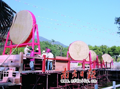 圭峰庙会水上舞台两侧的八大鼓已安装完成。黄少玮摄