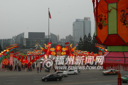 福建大剧院门口布置了一个“两岸共同庆祝大三通”大型灯组,反映了两岸实现大三通的艰难过程,为两岸人民祈福。