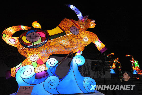 2月4日,市民在观赏花灯“牛气冲天”。