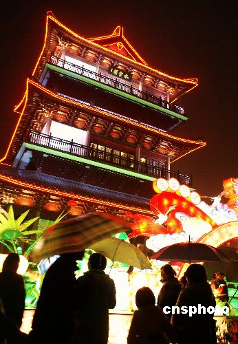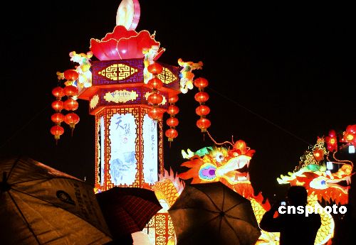 江苏盐城市民雨中观赏新春灯会