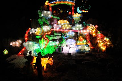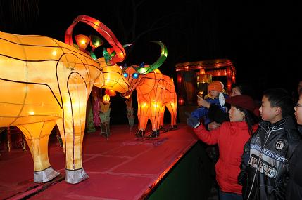 当晚,占地400多亩的山东省淄博市淄川区奎盛园里灯火辉煌,第十届淄博民间艺术花灯节在这里开幕。淄博花灯历史悠久,是省级非物质文化遗产,奎盛园已连续举办了九届民间艺术花灯节。今年,他们共投资80万元,安装了大型机械灯80组,传统灯与现代科技灯相结合,依山势组装,凸显特色,相得益彰。据悉,花灯将一直持续到正月十八。