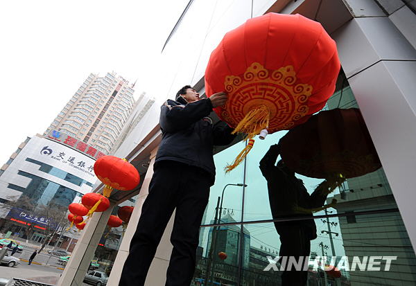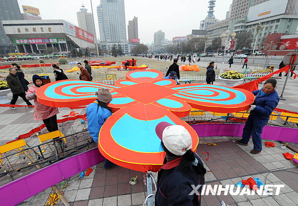1月19日,几位工人在兰州市东方红广场架设中国结彩灯。