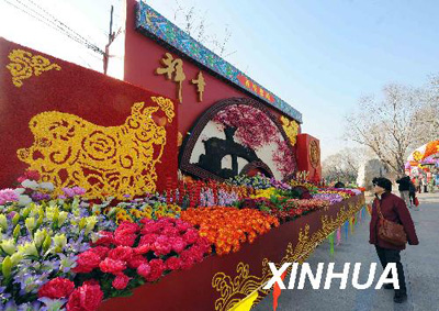 1月15日,一位游客在龙潭公园内观看已经布置好的花坛。