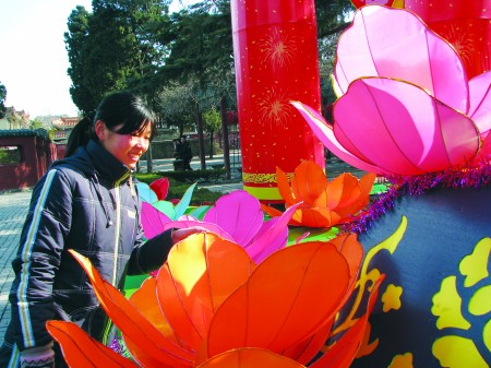 1月11日,岱庙挂起了象征喜气的花灯。工作人员介绍,今年的灯会将于正月初一举办,届时,市民和游客可以去赏灯。图为一女士正喜气洋洋地看花灯。