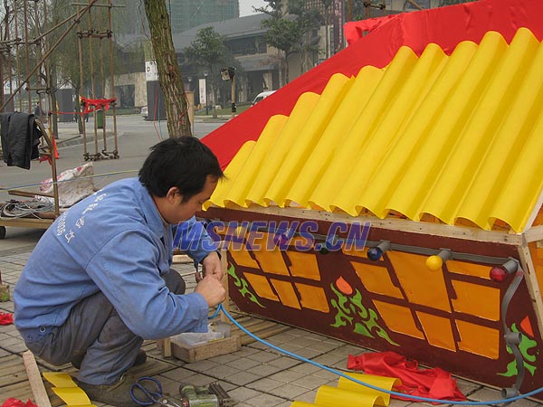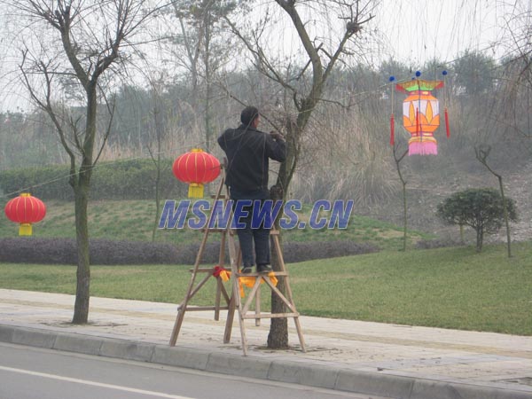 1月8日,在眉山市岷江东湖饭店外的大道上,工作人员正在为即将推出的2009眉山新春大型艺术灯会做准备。接线、挂灯笼……工作人员不亦乐乎地忙碌,也让路过的市民感受到了节日的喜庆氛围。
