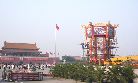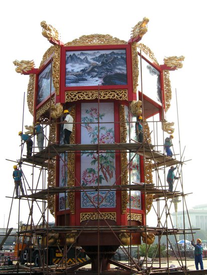 2008年9月20日,天安门广场上,工人们正紧张的吊装宫灯。宫灯净高9.9米。这是北京目前最大的宫灯,其全部材质都是由上好木料制成并经过专业工匠的雕琢,宫灯上的龙头惟妙惟肖。同时,宫灯上的牡丹图案和长城全部采用先手绘后喷绘的技术影印而成,更能体现牡丹和长城的层次感和视觉效果。今年的天安门广场国庆中心花坛以中国传统造型宫灯为主景,在主景周围形成圆形花坛,并在花坛外围布置环形喷泉。9月27日,全新的国庆花坛将与公众见面。