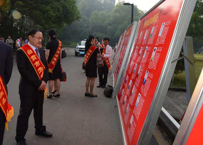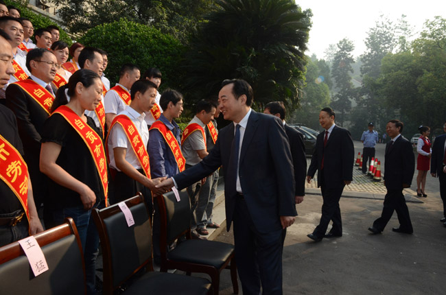 表彰大会前,雷洪金、刘永湘、陈华、潘泽金等自贡市领导亲切会见受表彰的100名劳动模范并与大家合影留念。