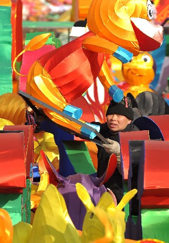 1月15日,工匠们在赶制“福牛”花灯。近日,来自四川自贡的工匠们在银川文化城赶制各色花灯,迎接即将到来的春节。据了解,春节期间,银川文化城将举办2009大型灯会,并开展民俗表演、慈善义卖、杂技表演等节庆活动。