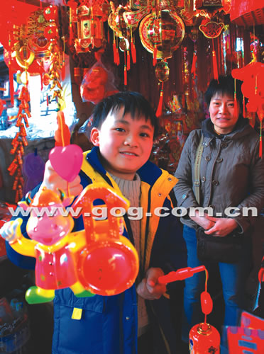 图为一位好不容易买到“牛”灯的小孩露出了笑容。