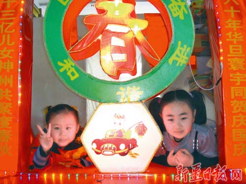 2月7日,两名女孩在一盏花灯下留影。裕民县举办元宵节灯会,参展单位制作了上百盏各式花灯。