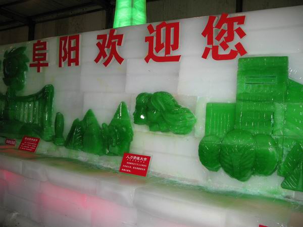 本次冰灯艺术节共搭建冰灯展厅1000平方米,是目前国内展厅面积最大的冰灯艺术展,用冰量达到1000吨,哈尔滨冰灯冰雕艺术协会副会长姜洪珊应邀亲自设计,20多位哈尔滨冰灯艺术技师精雕细琢,共有40组冰灯灯组在冰灯艺术节亮相。灯展分为4大展区,分别是祖国风采区、魅力阜阳区、欧陆风情区、儿童天地区。祖国风采区,是为庆祝建国六十华诞、展示祖国风采设计制作的冰灯节主景观区,灯组有天安门、中华门、人民英雄纪念碑等;魅力阜阳区,是为宣传阜阳建设成就、树立阜阳改革开放新形象而设计制作的,主要景观有阜阳市六大名片冰灯浮雕,主要表现阜阳“九州通衢看颍淮、江淮粮仓书神奇、三清贯颍滨水城、人力资源新引擎、煤电能源展新姿、做活商贸大文章”的崭新形象、独特优势和发展活力。表现阜阳历史文化底蕴的景观有文峰塔、奎星楼、欧阳修赵概二老相会等冰灯;欧陆风情区,主要灯组有俄罗斯城堡、西班牙钟楼、埃菲尔铁塔、凯旋门等,洋溢着浓郁的异域风情;儿童天地区,主要冰灯组有雪娃冬冬、圣诞老人、冰灯凉亭等。同时还专门为孩子们设计了戏雪乐园,在这里可以做冰车、看冰灯、赏冰雕、堆雪人、打雪仗,其乐无穷,好玩刺激。整个冰灯展厅内凉气袭人、舒适惬意,冰灯灯组晶莹剔透、流光溢彩,给人超凡脱俗的视觉享受。