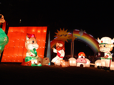 灯会园区四个入口都有一只吉祥牛铃铃欢迎嘉宾,主入口区则是一只特大号的铃铃,入口的天桥处以无数个小灯泡组成的华丽的灯网妆点。顺着园区的走道,让铃铃带你一游台中景点,东海路思义教堂变成了花灯,让人惊艳,铃铃与妞妞还和耶稣一起赏花灯呢!