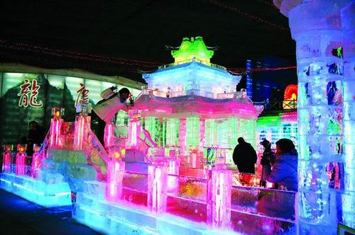 1月16日晚,主题为“盛世中华”的第二十三届龙庆峡冰灯艺术节揭开面纱。位于京郊延庆县的龙庆峡冰灯现已成为京城及周边广大群众冬季不可或缺的旅游项目之一。冰雕雪雕流光溢彩,花灯彩灯交相辉映,焰火礼花尽情绽放,欢歌 笑语响彻山谷。游人赏冰灯可以持续到2月底。