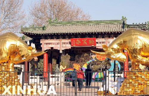 1月14日,在济南趵突泉南门,两只神采奕奕的“金牛”向来往的游客和行人“致意”。 作为趵突泉牛年新春花灯会的主角,“金牛”受到特别推崇,成为迎宾亮点。