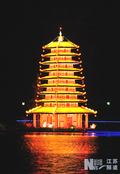 8月28日,“湖光塔影”大型彩灯矗立在尚湖水面。